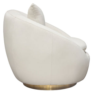 The chair offers a true glam, sophisticated look for your home decor. With its sensual curved silhouette, sloping arms and brushed gold metal trim base, the chair will become the focal point of any space. Covered in a plush light cream velvet, its presence is undeniable.