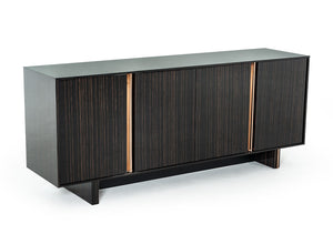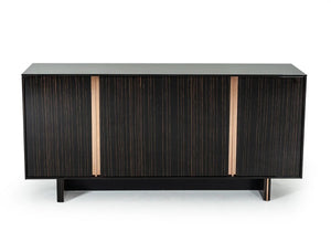 This modern buffet table is a unique and interesting addition to your dining space. The neutral colors allow for this piece to easily blend in with your dining area. Spacious doors allow for maximum storage for dishes, silverware, or decor items. With the ebony finish, this buffet can easily be dressed up or down. We recommend an eclectic or art deco aesthetic for this buffet.