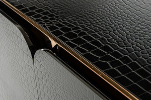 This modern buffet table is a unique and interesting addition to your dining space. The neutral colors allow for this piece to easily blend in with your dining area. Spacious doors allow for maximum storage for dishes, silverware, or decor items. With the black finish, this buffet can easily be dressed up or down. We recommend an art deco aesthetic for this buffet.