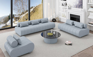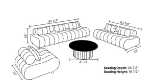The sofa is composed of one loveseats, one sofa, and one chair, creating an open and sociable sofa set perfect for lounging or entertaining. Without the distraction of recliner mechanics or tech elements, the Puffer focuses purely on form and comfort, with thick, vertical channeled cushioning and Six geometric throw pillows that echo the curved design language of the piece.