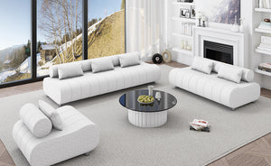 This sofa set is an ideal centerpiece for serene, high-end interiors that prioritize shape, texture, and conversation-friendly comfort.