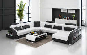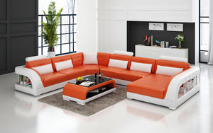 The Lacus Modern U-Shape Leather Sectional is handmade with genuine Italian or bonded leather. Choose your preferred color leather from a selection of 10 distinct colors. This leather sectional features two built in storage spaces big enough to display books or decorative items. Each top headrest is adjustable. This modern sectional is a stylish and chic addition to your living space. To complete the look of your living space we recommend adding the armless chair and coffee table. Cup holders and USB ports are recommended for larger families to optimize maximum enjoyment. An additional bed function makes a great movie night with the family or space for unexpected guests. With the generous size of this sectional, family and friends will gladly socialize in comfort.