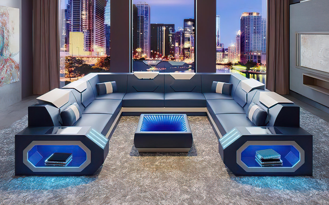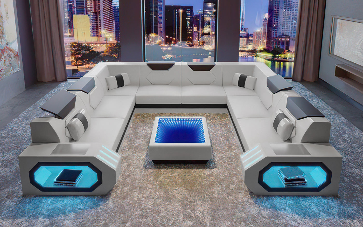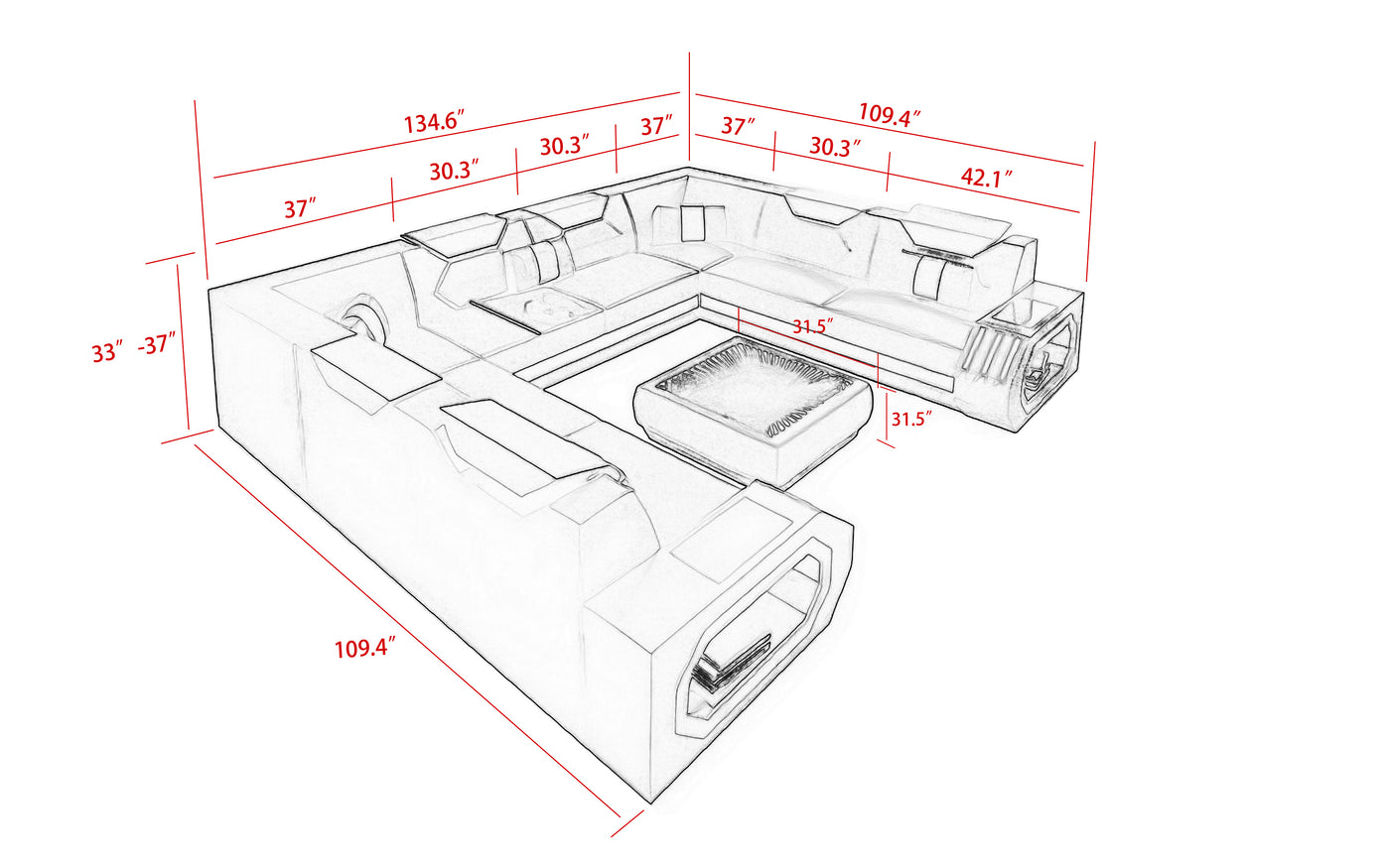 The Sahara U Shape Leather Sectional is a stunning addition to any modern living room. This sectional is designed to offer comfort and style, with its spacious seating, adjustable headrests, and built-in LED lighting. The sectional is available in a range of colors, with customization options for chaise configuration and leather type - choose between Italian leather or bonded leather. With a versatile U-shape design, this sectional provides ample seating space for your family and guests, while adding a touch of sophistication to your living room. Elevate your lounge experience with the luxurious Sahara U Shape Leather Sectional.