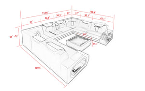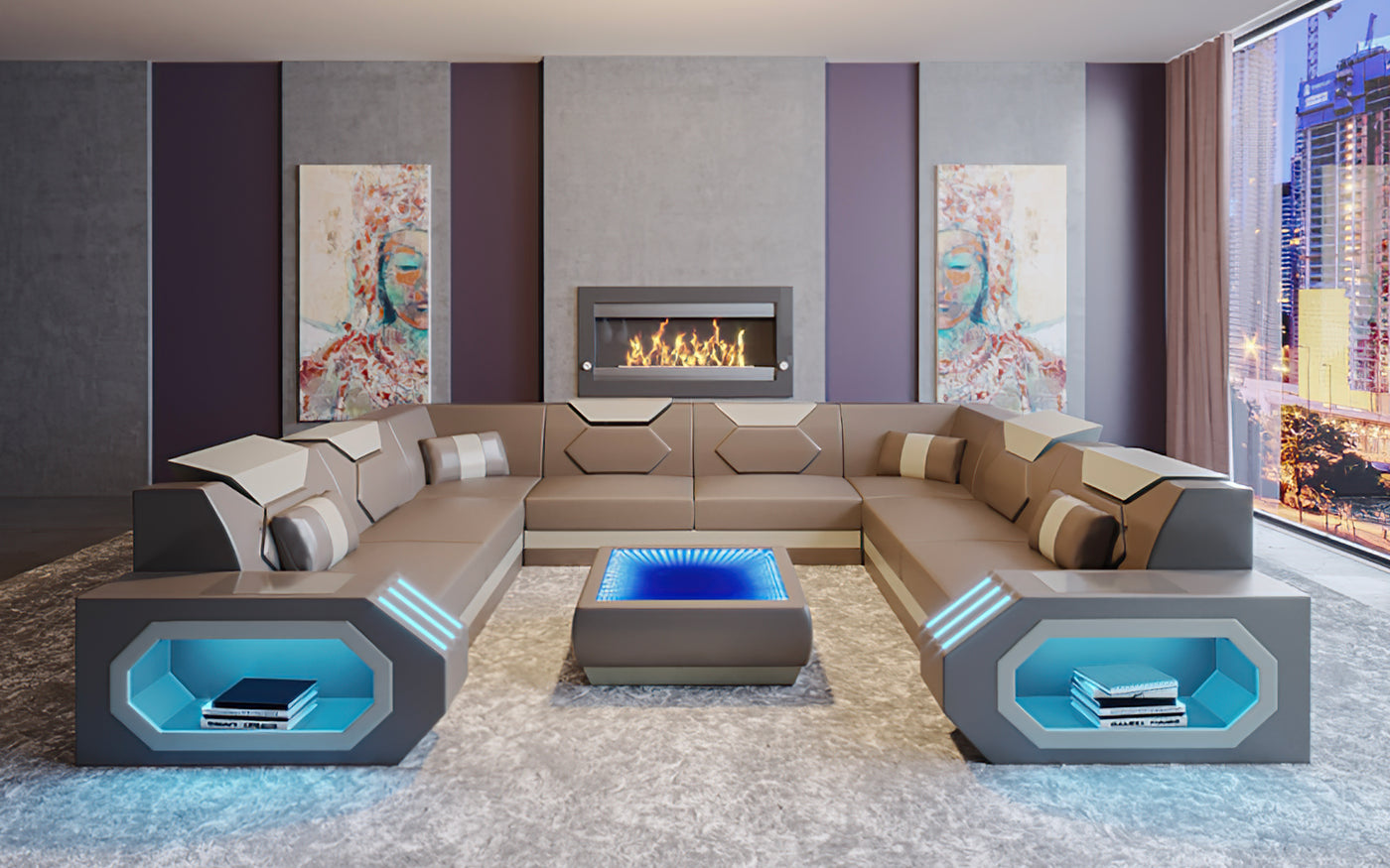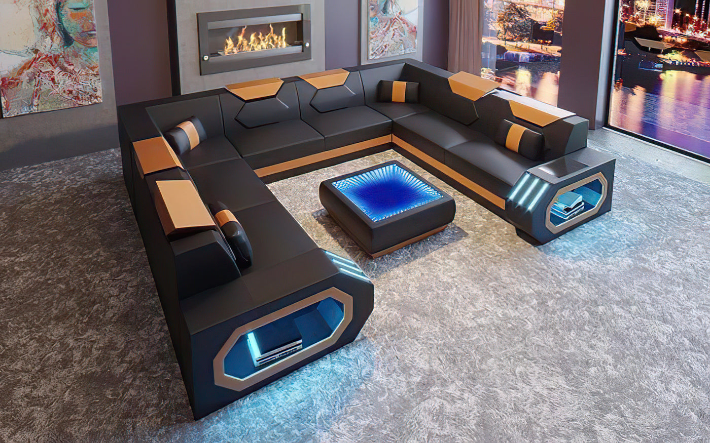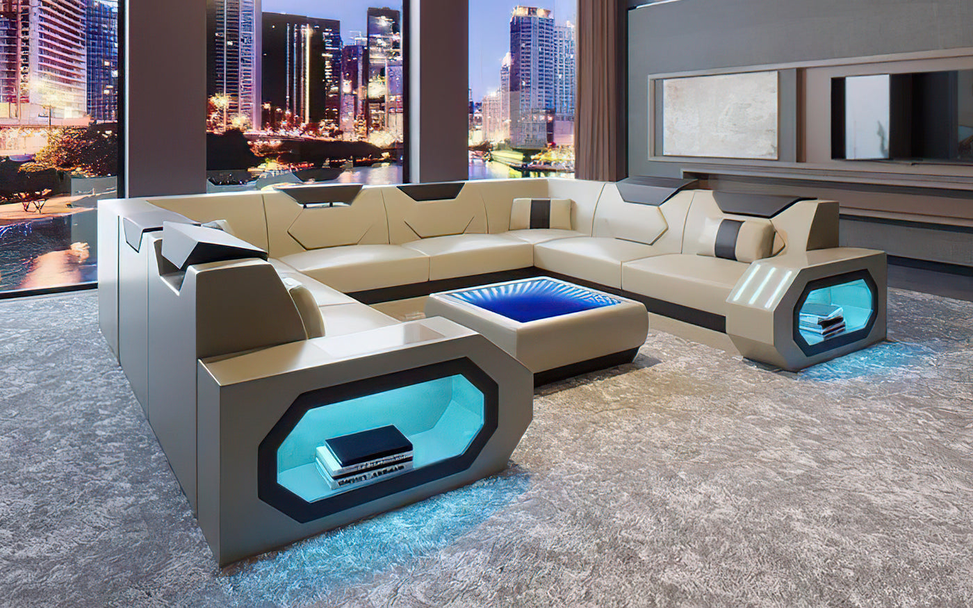 The Sahara U Shape Leather Sectional is a stunning addition to any modern living room. This sectional is designed to offer comfort and style, with its spacious seating, adjustable headrests, and built-in LED lighting. The sectional is available in a range of colors, with customization options for chaise configuration and leather type - choose between Italian leather or bonded leather. With a versatile U-shape design, this sectional provides ample seating space for your family and guests, while adding a touch of sophistication to your living room. Elevate your lounge experience with the luxurious Sahara U Shape Leather Sectional.