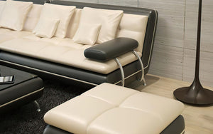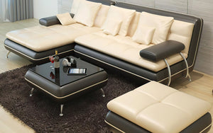 The Uldir Mini Modern Leather Sectional is available in two-toned or contrasting colors in Italian leather and bonded leather. Choose your preferred color leather from a selection of 10 distinct colors. The sleek, inviting design of this couch quickly catches the eye of visitors. Crafted custom to fulfill your desired aesthetic. The spacious chaise is perfect to lay down and rest after a busy day. Choose your configuration left hand facing or right-hand facing chaise to customize to your desired design. This sleek, modern sectional is a must have for every contemporary home. To complete the look of your living space we recommend adding the coffee table and ottoman. Cup holders and USB ports are recommended for larger families to optimize maximum enjoyment. An additional bed function makes a great movie night with the family or space for unexpected guests. With the generous size of this sectional, family and friends will gladly socialize in comfort.
