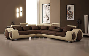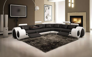 The Bouie Leather Sectional with Adjustable Footrest is available in 10 different colors of genuine Italian or bonded leather and has a kiln-dried hardwood frame for long-lasting sturdiness. This sectional features lounging space for up to seven people. Each top headrest is adjustable. A small console is included to hold drinks and remotes. This modern leather sectional is inviting and stylish, instantly making it a conversation piece. The interesting circular design of this modern leather sectional will accent your decorative pieces beautifully. To complete the look of your living space we recommend adding the armless chair and coffee table. Cup holders and USB ports are recommended for larger families to optimize maximum enjoyment. An additional bed function makes a great movie night with the family or space for unexpected guests. With the generous size of this sectional, family and friends will gladly socialize in comfort.